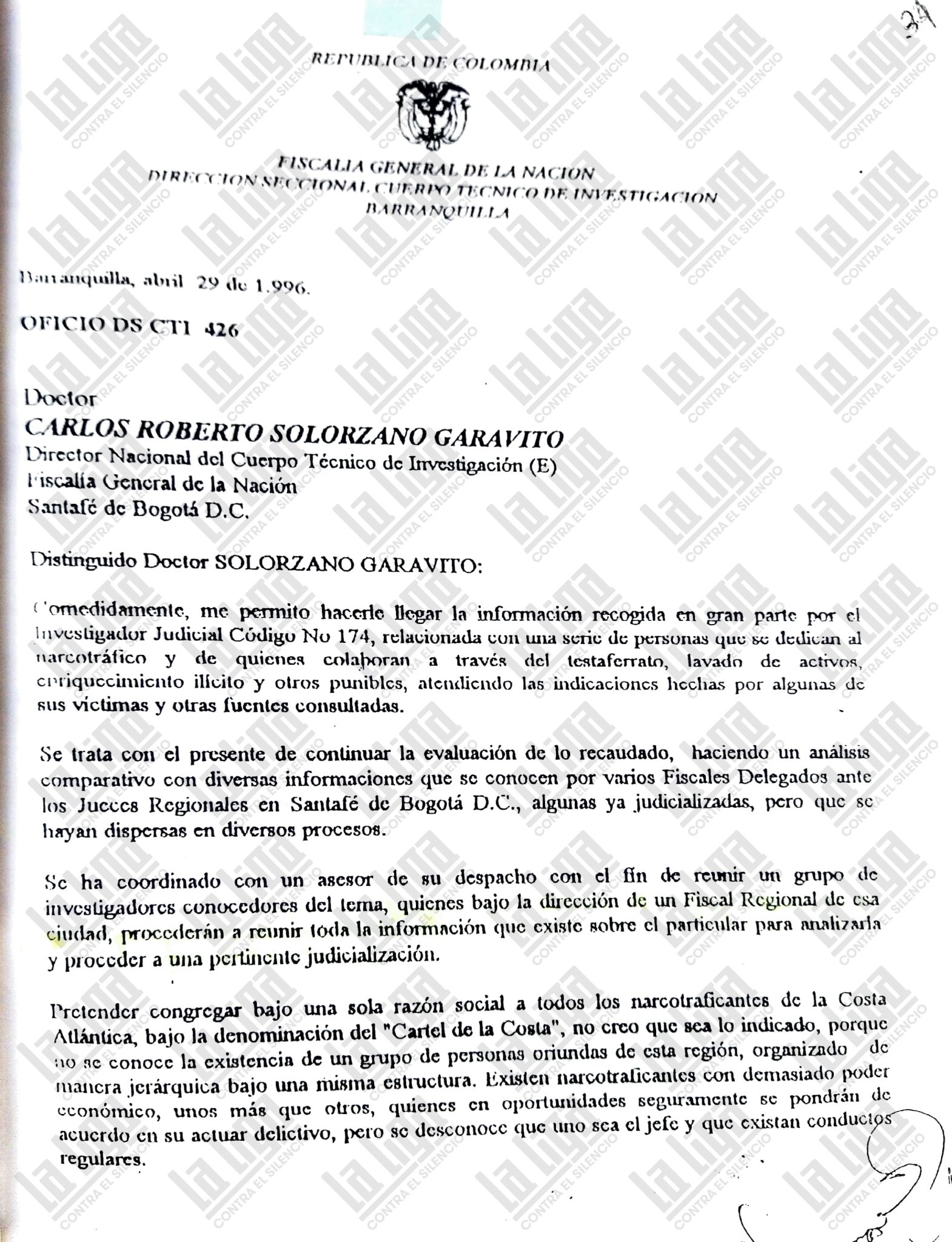 Después de un largo periodo en el fondo de un archivo, ese papel ha salido a flote. El oficio DS CTI 426 resultó de las averiguaciones de un investigador judicial identificado con el código 174. En las primeras páginas Álvaro Vivas Botero, el exdirector del CTI en Barranquilla, quien lo firma, expuso dudas: no sabía si debían “congregar bajo una sola razón social” a todos los narcotraficantes de la Costa. “No se conoce la existencia de un grupo de personas oriundas de esta región organizado de manera jerárquica bajo una misma estructura. Existen narcotraficantes con demasiado poder económico, unos más que otros, quienes en oportunidades seguramente se pondrán de acuerdo en su actuar delictivo, pero se desconoce que uno sea jefe y que existan conductos regulares”, escribió.