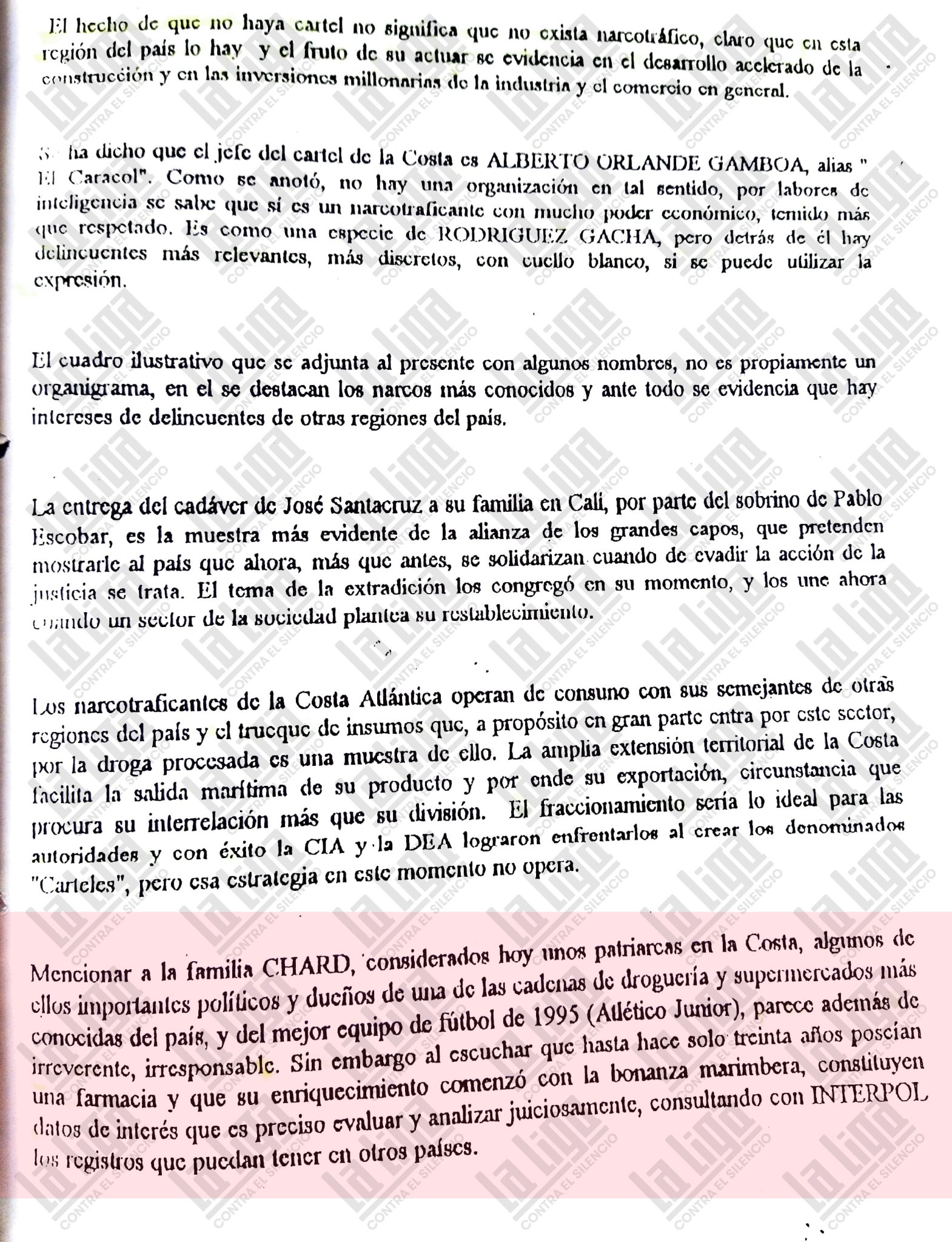 Son 28 páginas firmadas por Álvaro Vivas Botero, en aquel momento director seccional del CTI en Barranquilla, y enviadas a Carlos Roberto Solórzano Garavito, entonces director nacional (encargado) de ese cuerpo. Este y otros informes están incluidos en un expediente recopilado por la UNAIM, Unidad Antinarcóticos e Interdicción Marítima (hoy Dirección Especializada contra el Narcotráfico) con el radicado 114 en contra de Orlande Gamboa, alias ‘El Caracol’, descrito en el informe del CTI como “un narcotraficante con mucho poder económico, temido más que respetado”. Orlande Gamboa tenía detrás delincuentes “más relevantes”, “más discretos” y “con cuello blanco”.