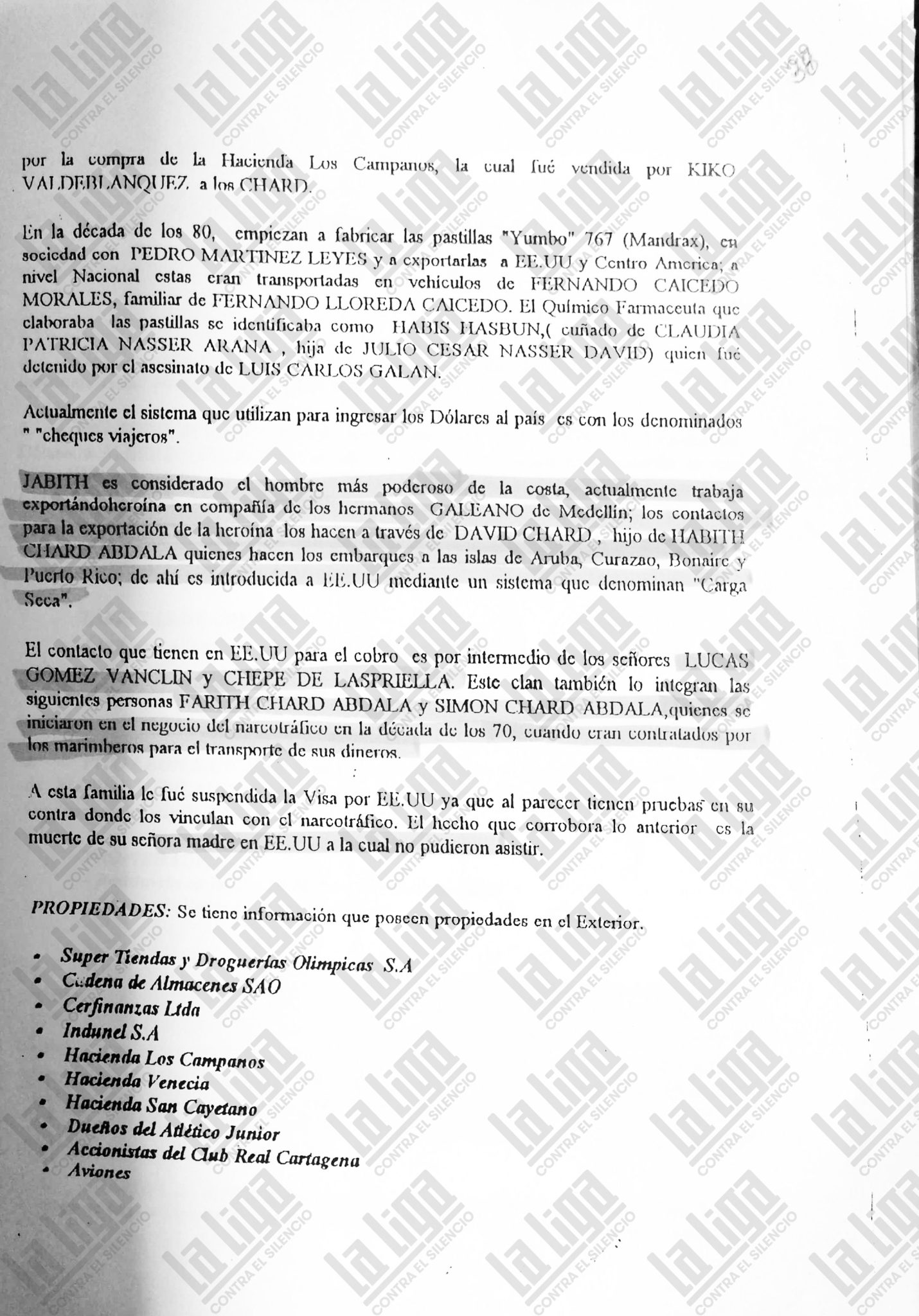 De Habib Char (escrito Jabith) el informe dice que en aquellos años era considerado “el hombre más poderoso de la Costa”; que exportaba heroína junto a los hermanos Galeano, de Medellín; que los contactos para esas operaciones las hacía su hijo David; que los embarques llegaban a las islas de Aruba, Curazao, Bonaire y Puerto Rico; y que de ahí viajaban a Estados Unidos por un sistema que llamaban ‘carga seca’.