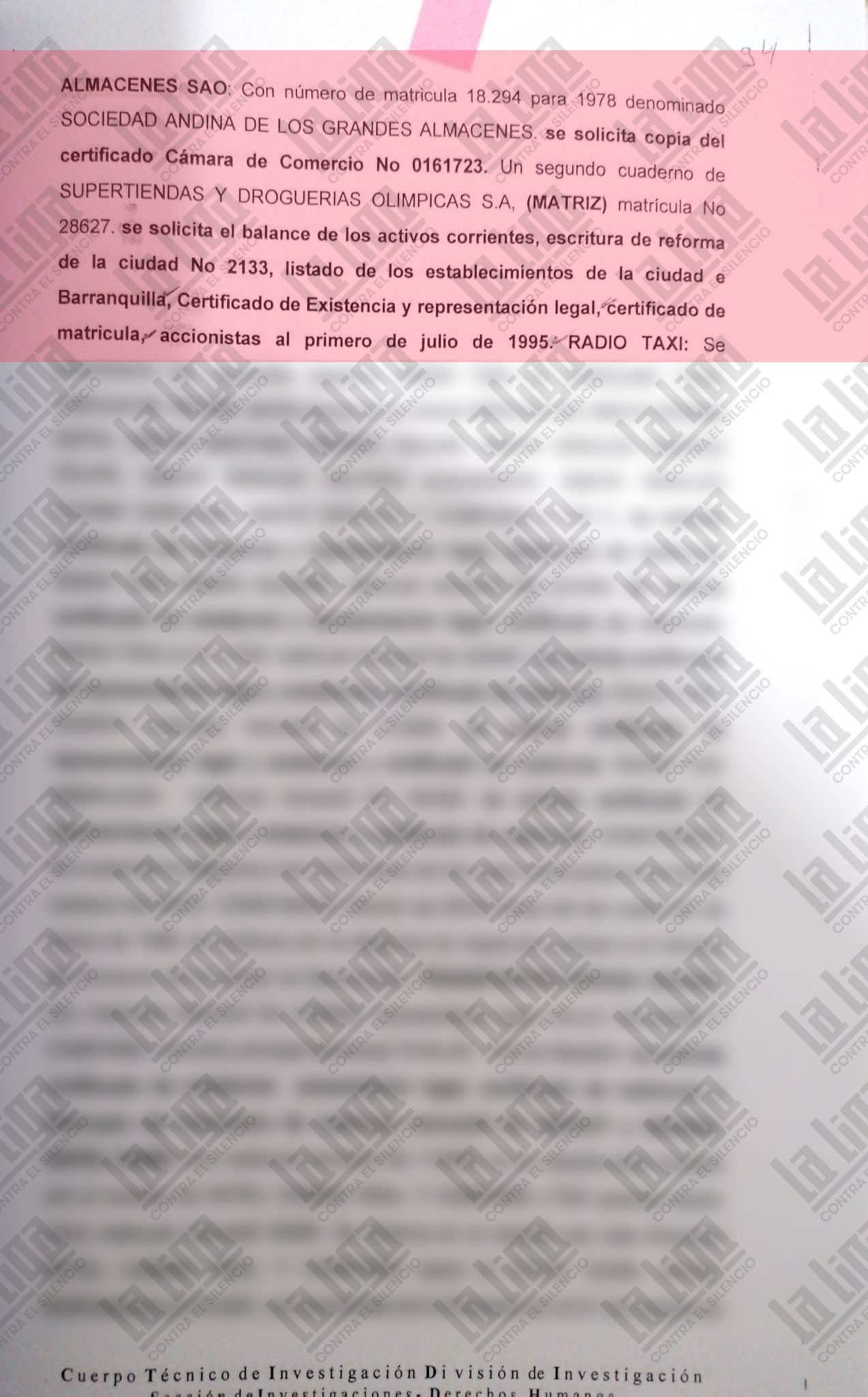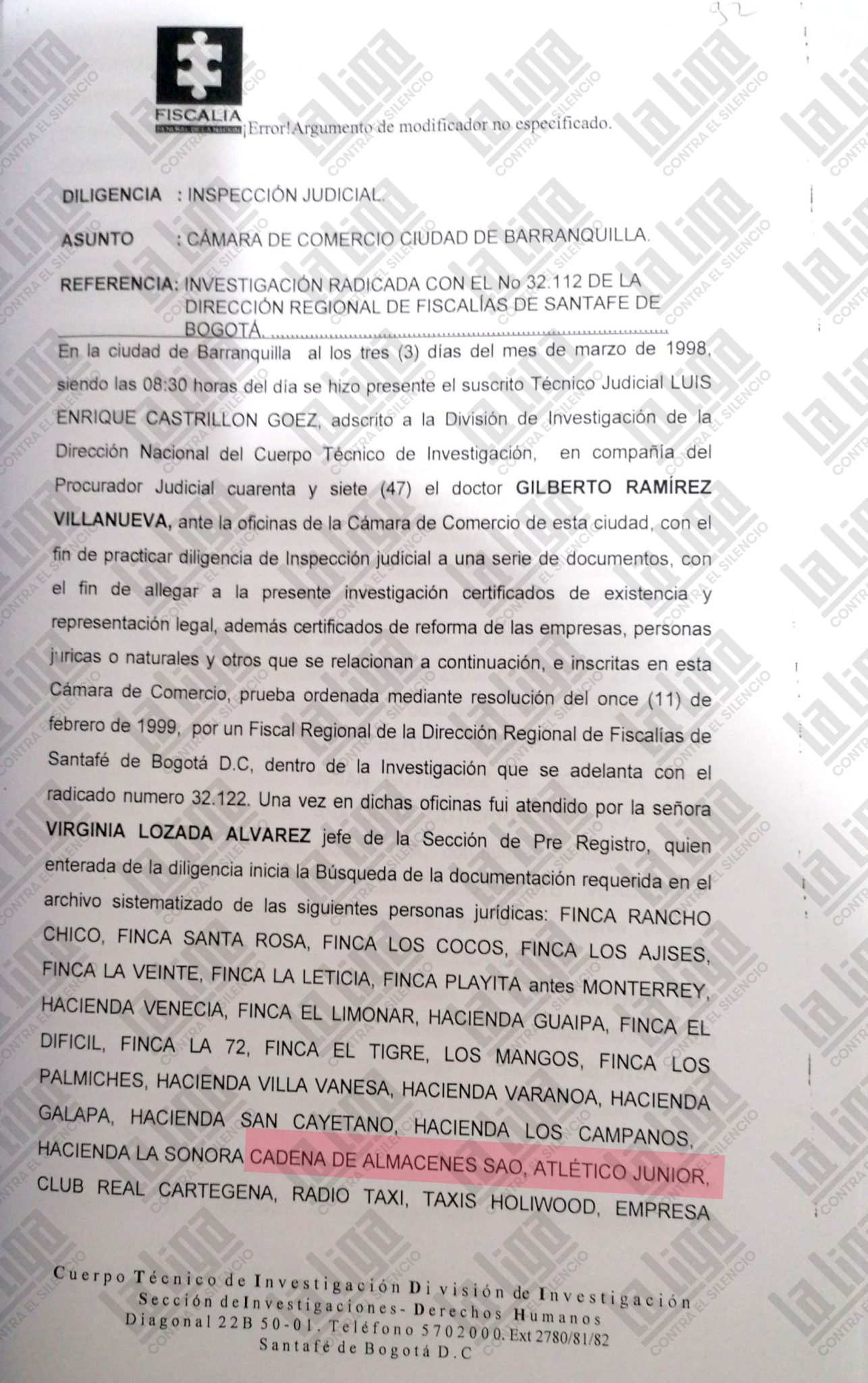 En los documentos que revisó La Liga hay constancia de que la Fiscalía ordenó solicitar fotocopias de las escrituras públicas de constitución, reformas, aumento de capital y nombres de los socios nuevos de una supertienda y droguería Olímpica abierta el 29 de octubre de 1997. Igualmente se solicitaron certificados de existencia y representación legal del equipo Junior de Barranquilla y de la cadena de almacenes SAO.