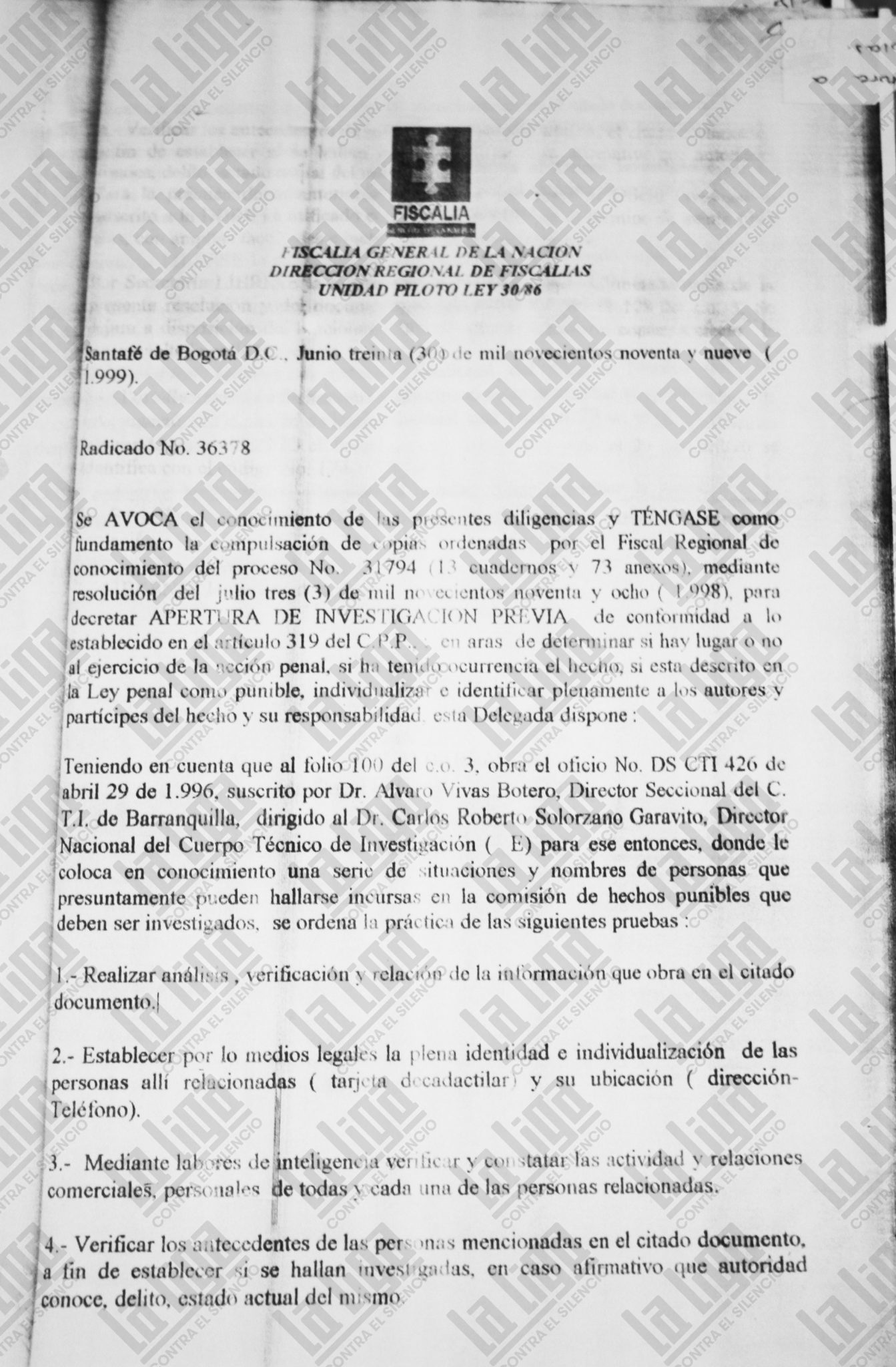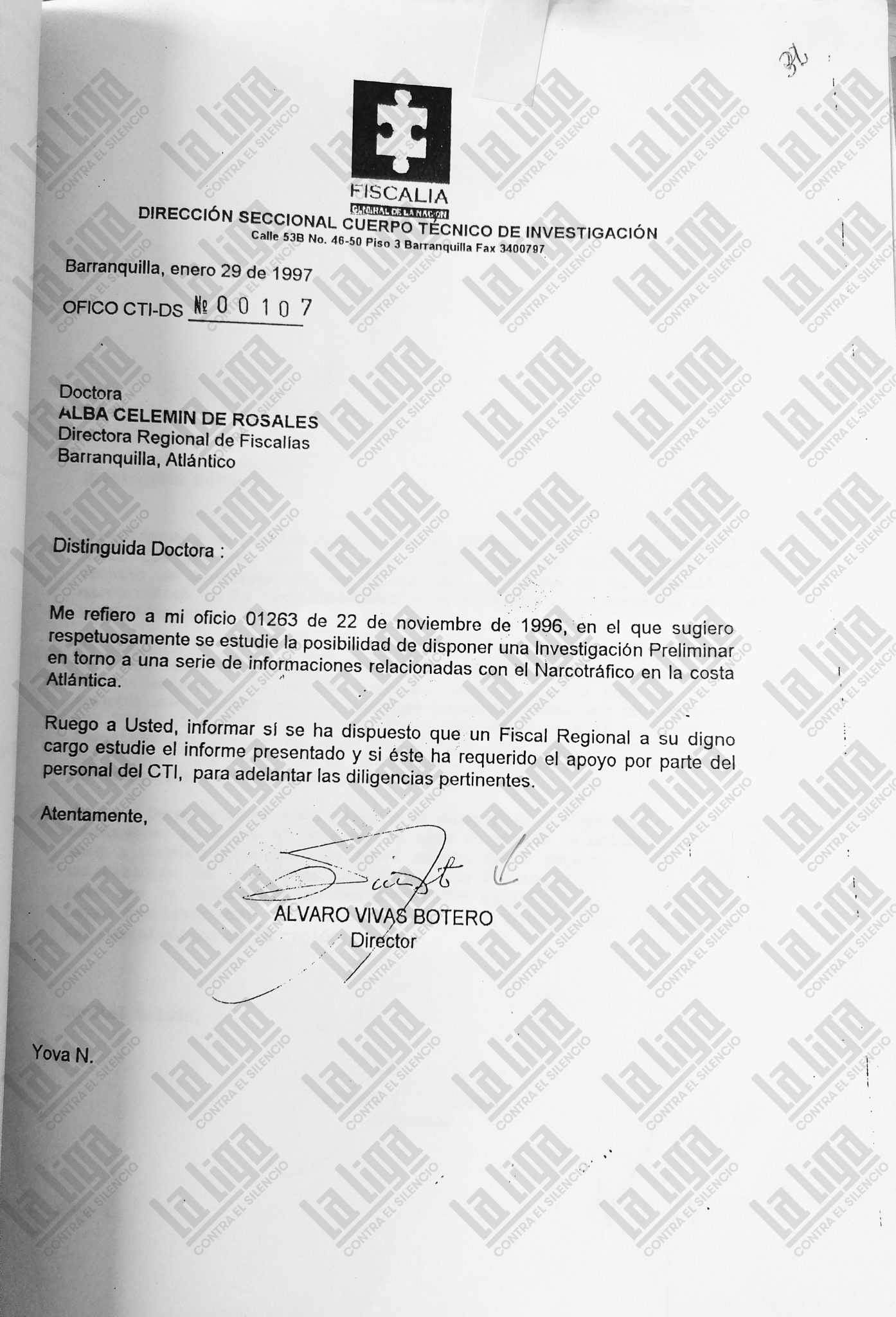 La gravedad de los hechos que expuso el oficio 426 no fue suficiente para abrir un proceso judicial contra los Char, o al menos así se desprende del expediente 114. Pero Vivas Botero no se rindió. En el oficio 01263 de noviembre de 1996, dirigido a Alba Celemín de Rosales, entonces directora regional de Fiscalías en Barranquilla, el funcionario envía fotocopia del informe 426, avisa que se trata del narcotráfico en la Costa y de personas que estarían vinculadas. Vivas Botero le ruega que abra un estudio para una investigación preliminar; se pone a la orden para que el CTI le brinde el apoyo que necesite y le aclara que la información ya había sido puesta en conocimiento de Armando Camacho Esquivel, el anterior fiscal regional.