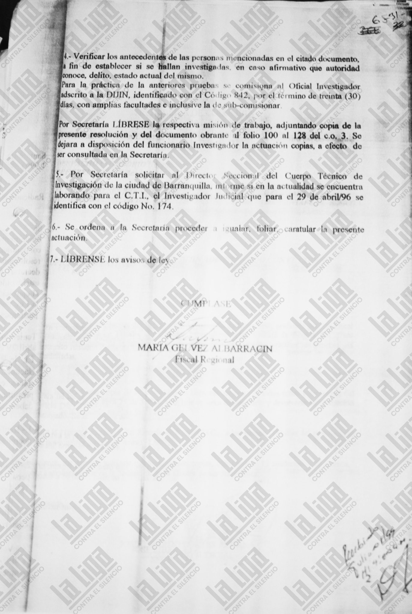 En enero de 1997 Vivas Botero le escribió de nuevo a Celemín de Rosales. En el oficio 00107 de enero 29 le pregunta si ha designado a un fiscal que estudie el informe presentado casi un año atrás. En el expediente no consta ninguna respuesta de la fiscal. Sí hay un nuevo informe, el radicado 36378 del 30 junio de 1999, donde la fiscal regional María Gelvez Albarracín pide retomar las conclusiones del escrito 426 y verificar la identidad y los antecedentes, actividades y relaciones comerciales de las personas mencionadas en ese oficio. La Liga presentó un derecho de petición a la Fiscalía con preguntas sobre las investigaciones contra los Char, pero el 23 de febrero se venció el plazo legal y no hubo respuesta. La Liga interpuso una tutela para obtenerla.