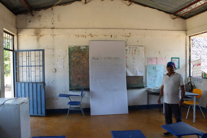 “Mire los baños de la escuela, ¿le parece normal?”, cuestionó el profesor Alfredo Santana, acompañante del capitán Miraval, al mostrar un local derruido y sin agua potable que, igual que el resto del pueblo, recibe electricidad durante unas horas diarias gracias a unos paneles solares. Tampoco hay manuales escolares en la comunidad puinave que ayuden a preservar la cultura, lamentó.